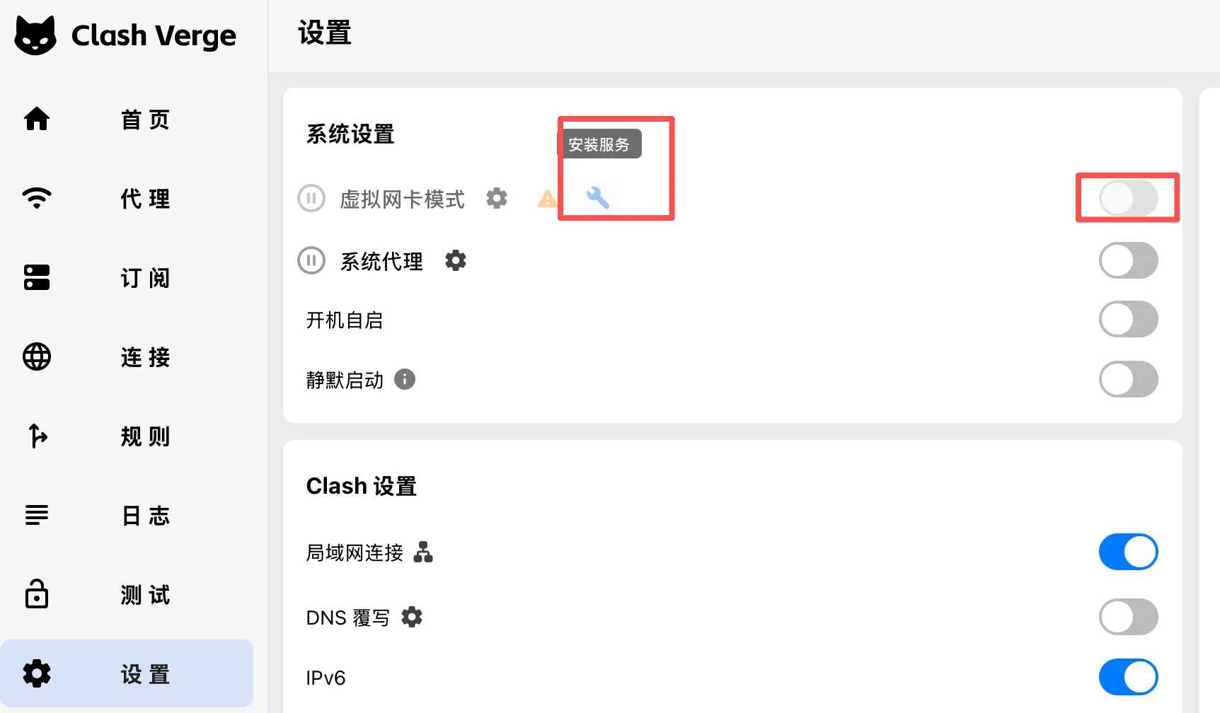 • 3) 点击 设置->虚拟网卡模式-> 安装服务,安装虚拟网卡